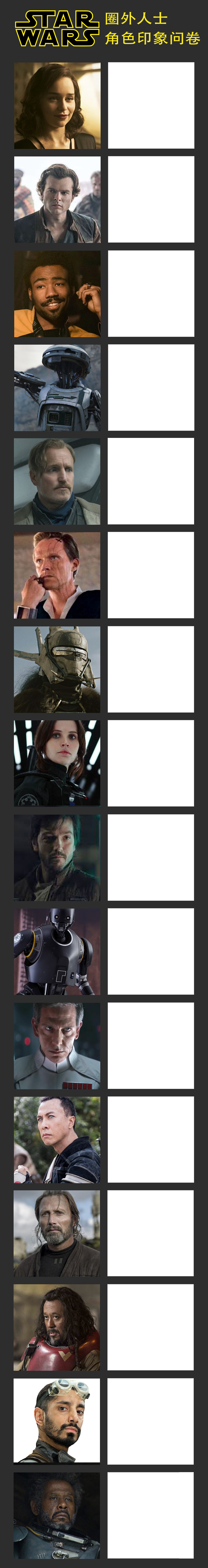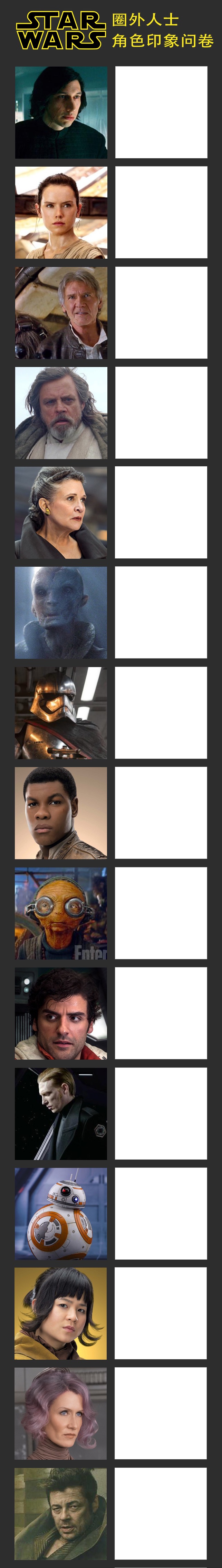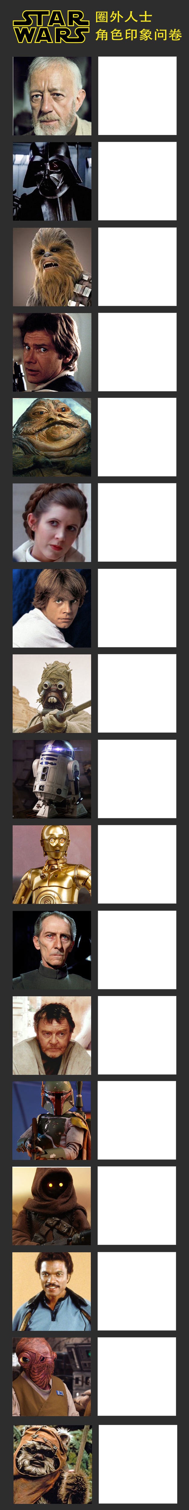 给没看过星战的朋友做了个“星战圈外人角色印象表”,涉及前传、正传、外传、后传,共四张图(前传角色放得有点多,一激动把好多没啥戏份的角色也放进去了)