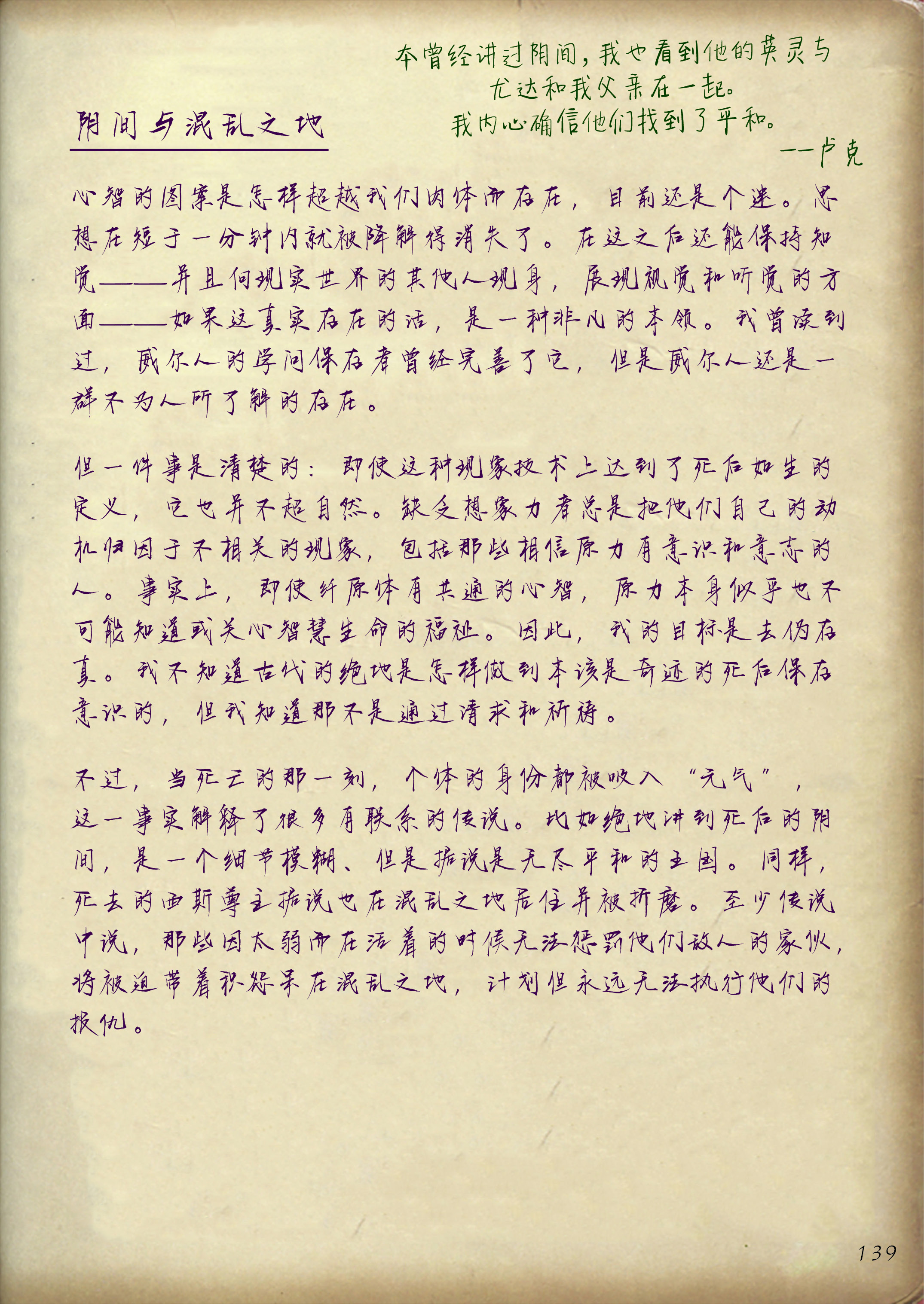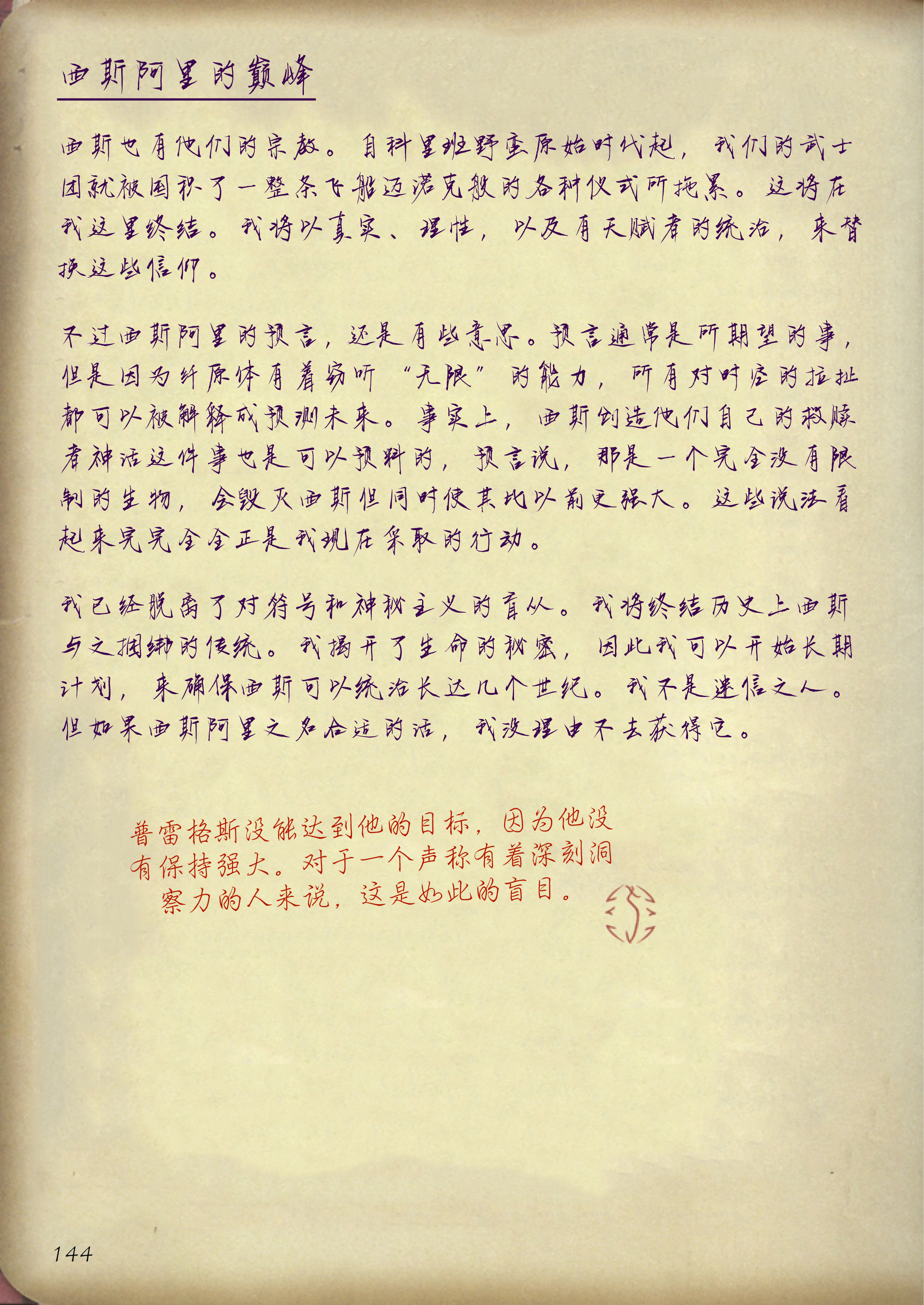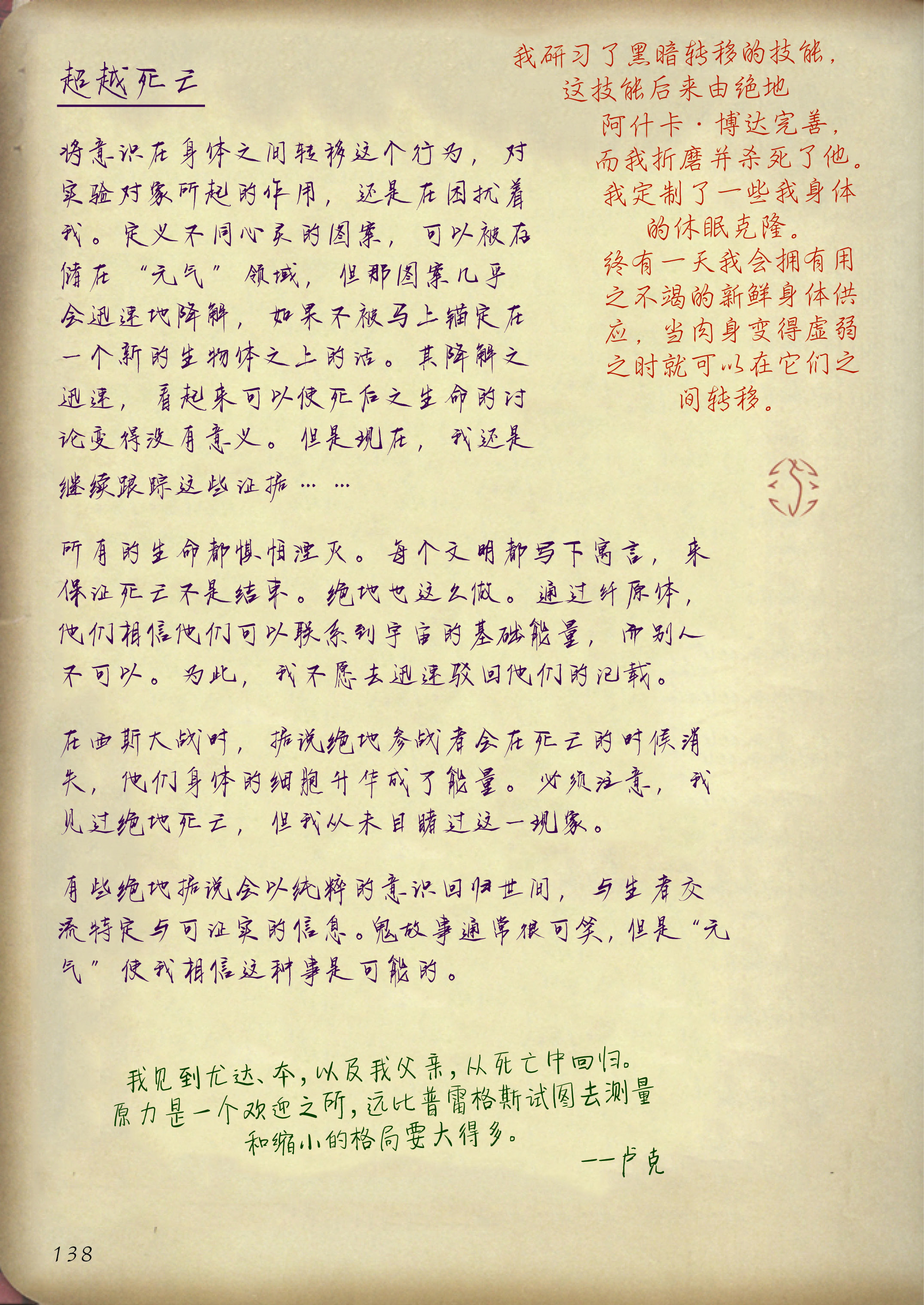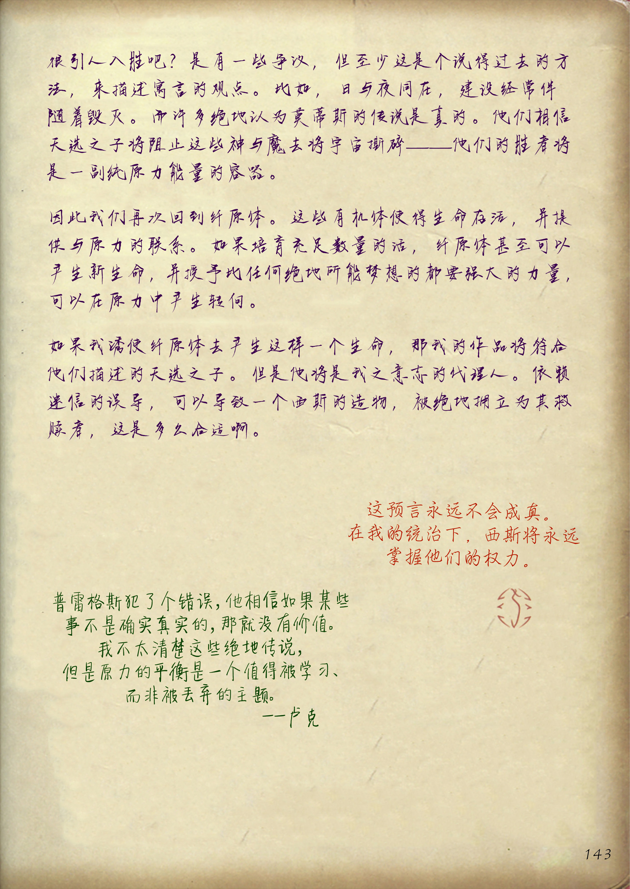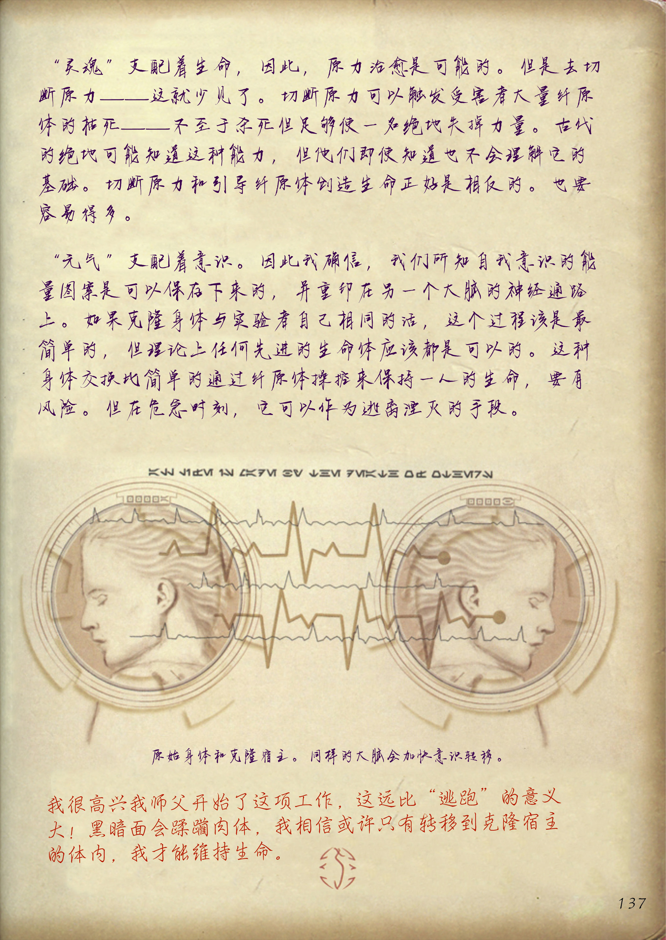 【我很高兴我师父开始了这项工作,这远比“逃跑”的意义大!黑暗面会蹂躏肉体,我相信或许只有转移到克隆宿主的体内,我才能维持生命。——西迪厄斯】