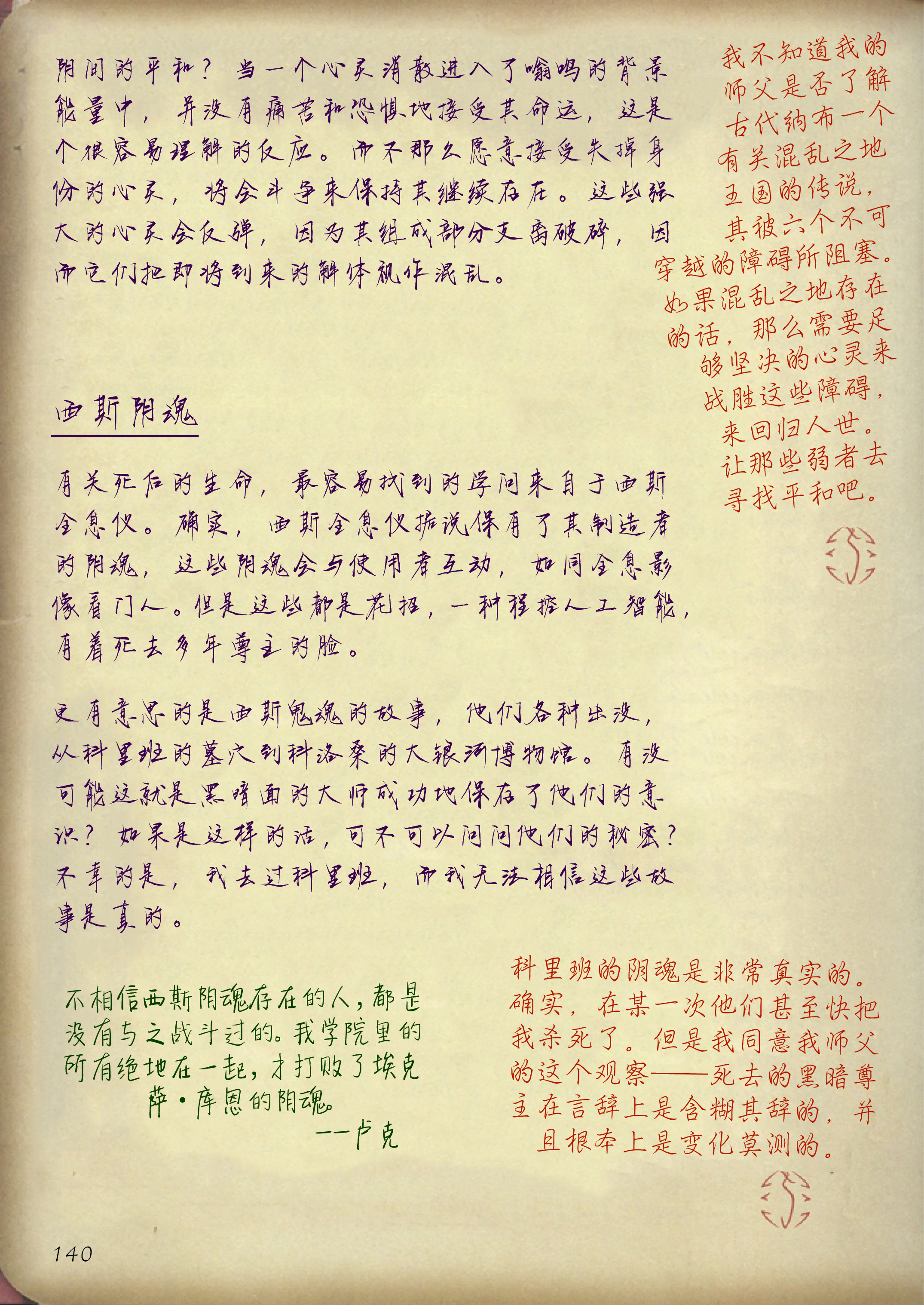 【科里班的阴魂是非常真实的。确实,在某一次他们甚至快把我杀死了。但是我同意我师父的这个观察——死去的黑暗尊主在言辞上是含糊其辞的,并且根本上是变化莫测的。——西迪厄斯】