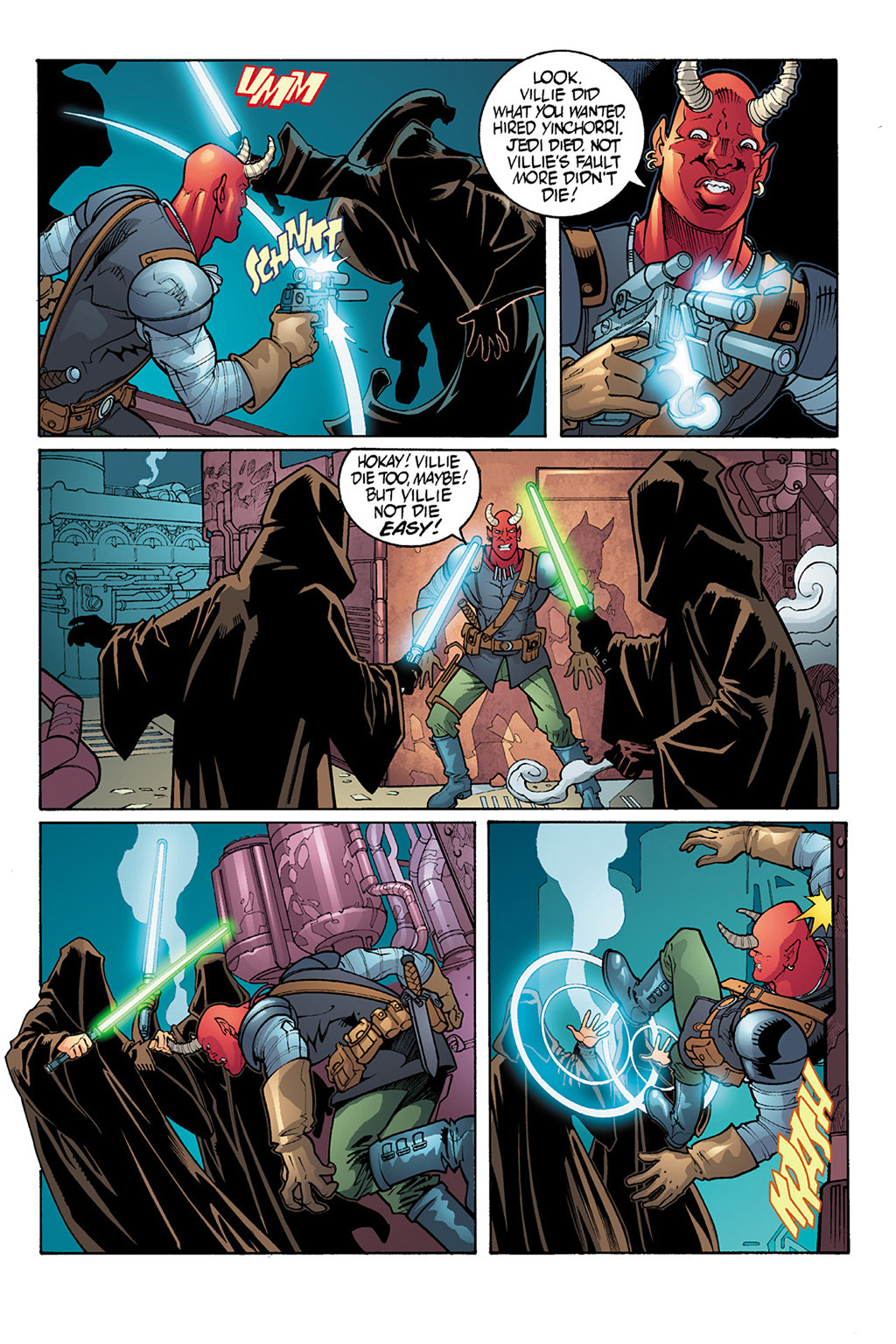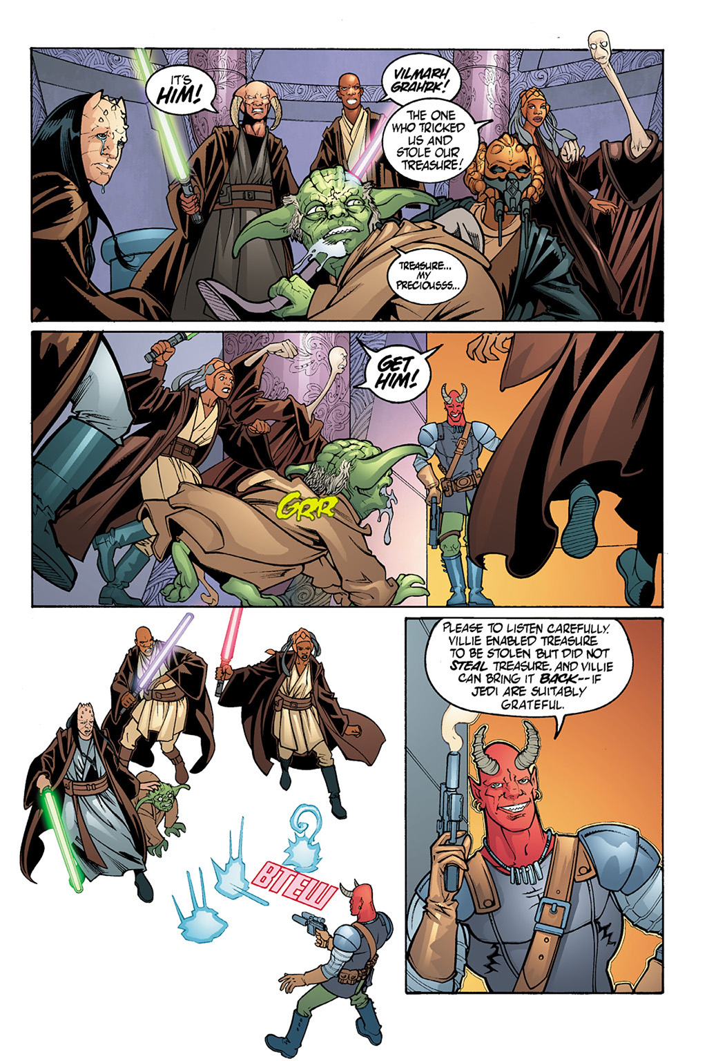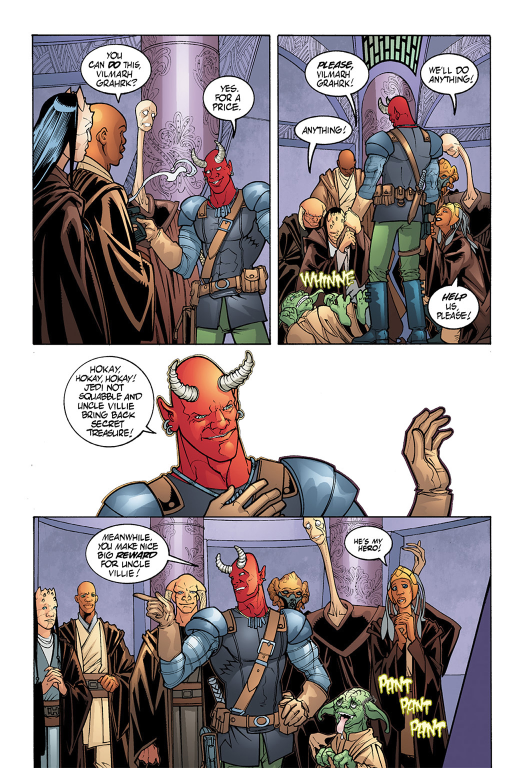 这是Republic的40 41期,The Devaronian Version《德瓦隆人版本》,讲的是因乔尔危机这个事件,但是是以那个德瓦隆人走私者的吹牛皮来叙述的,所以各种迷之黑,黑完西迪厄斯黑绝地,笑死人。(因乔尔危机的正经故事见Jedi Council: Acts of War这四本漫画。这在《普雷格斯》里被搞成了ppt作为西迪厄斯搞的第一个阴谋)