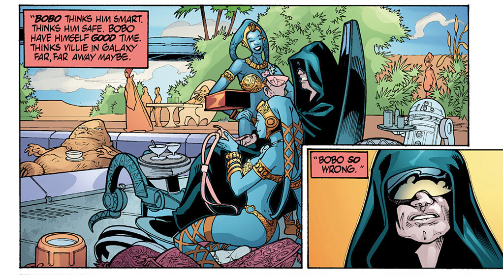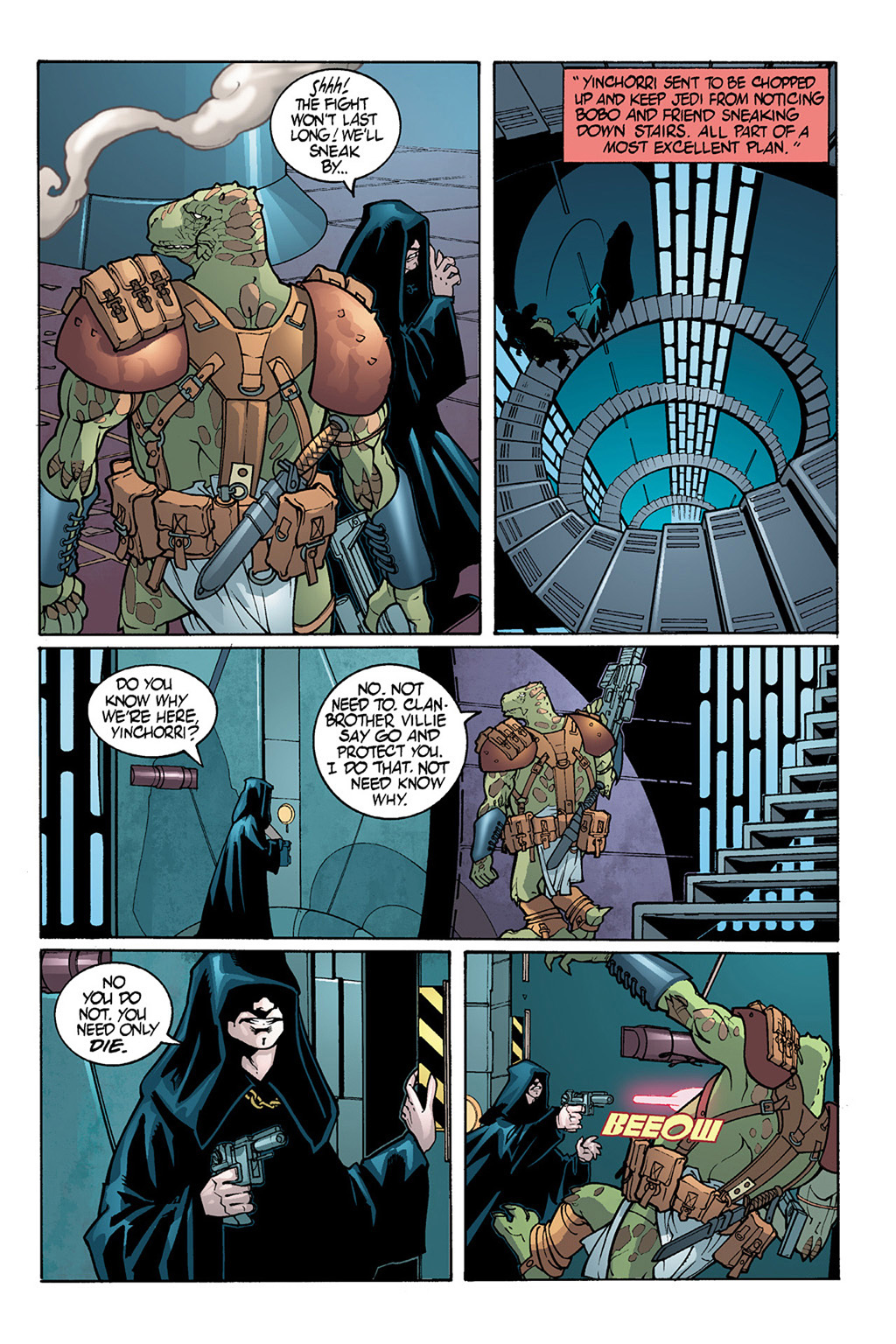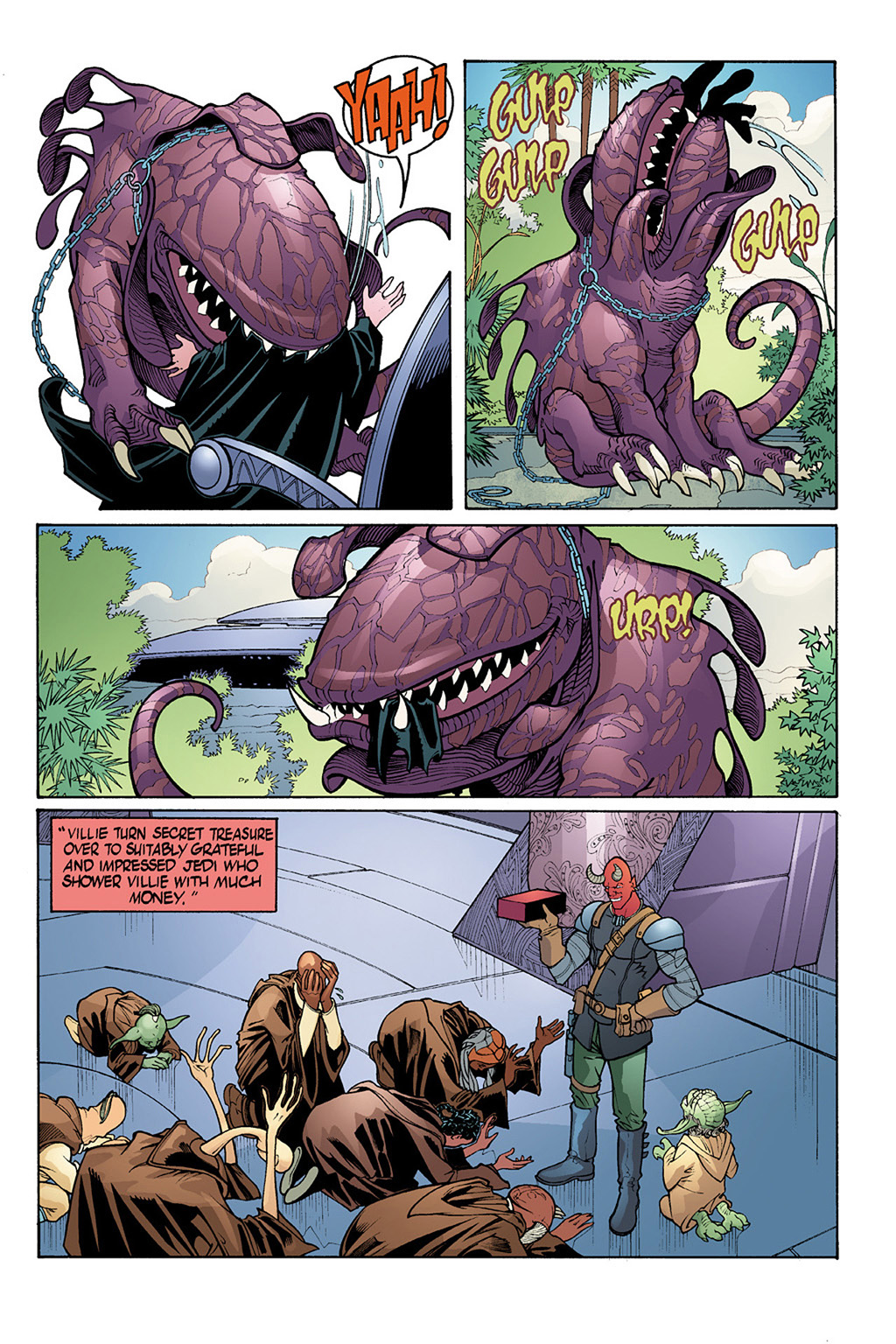 这是Republic的40 41期,The Devaronian Version《德瓦隆人版本》,讲的是因乔尔危机这个事件,但是是以那个德瓦隆人走私者的吹牛皮来叙述的,所以各种迷之黑,黑完西迪厄斯黑绝地,笑死人。(因乔尔危机的正经故事见Jedi Council: Acts of War这四本漫画。这在《普雷格斯》里被搞成了ppt作为西迪厄斯搞的第一个阴谋)